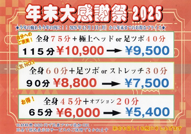 また各店舗でおすすめのコースをご用意しております。1年のお疲れを癒されにお越しください(^^)/